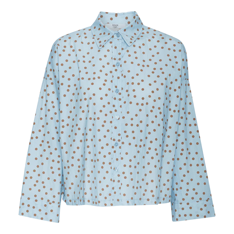 Skøn skjorte med klassisk krave og knaplukning foran, som giver et tidløst og stilrent look. Modellen er i en skøn blå farve med brune prikker, der giver et fint og lidt anderledes udtryk. En let og alsidig skjorte, som er nem at style – brug den til jeans for et afslappet hverdagslook eller til pæne bukser eller nederdel, hvis du vil dresse outfittet lidt mere op.