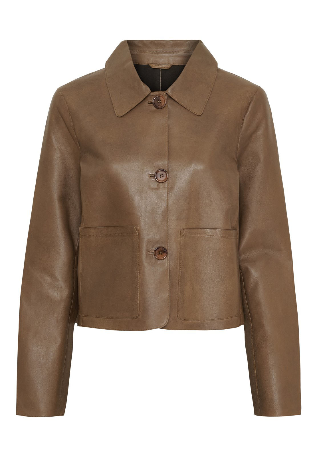 Cool skindjakke fra Butterfly Copenhagen lavet i det lækreste lammeskind. Jakken har knaplukning, klassisk krave, forlommer samt lange ærmer.