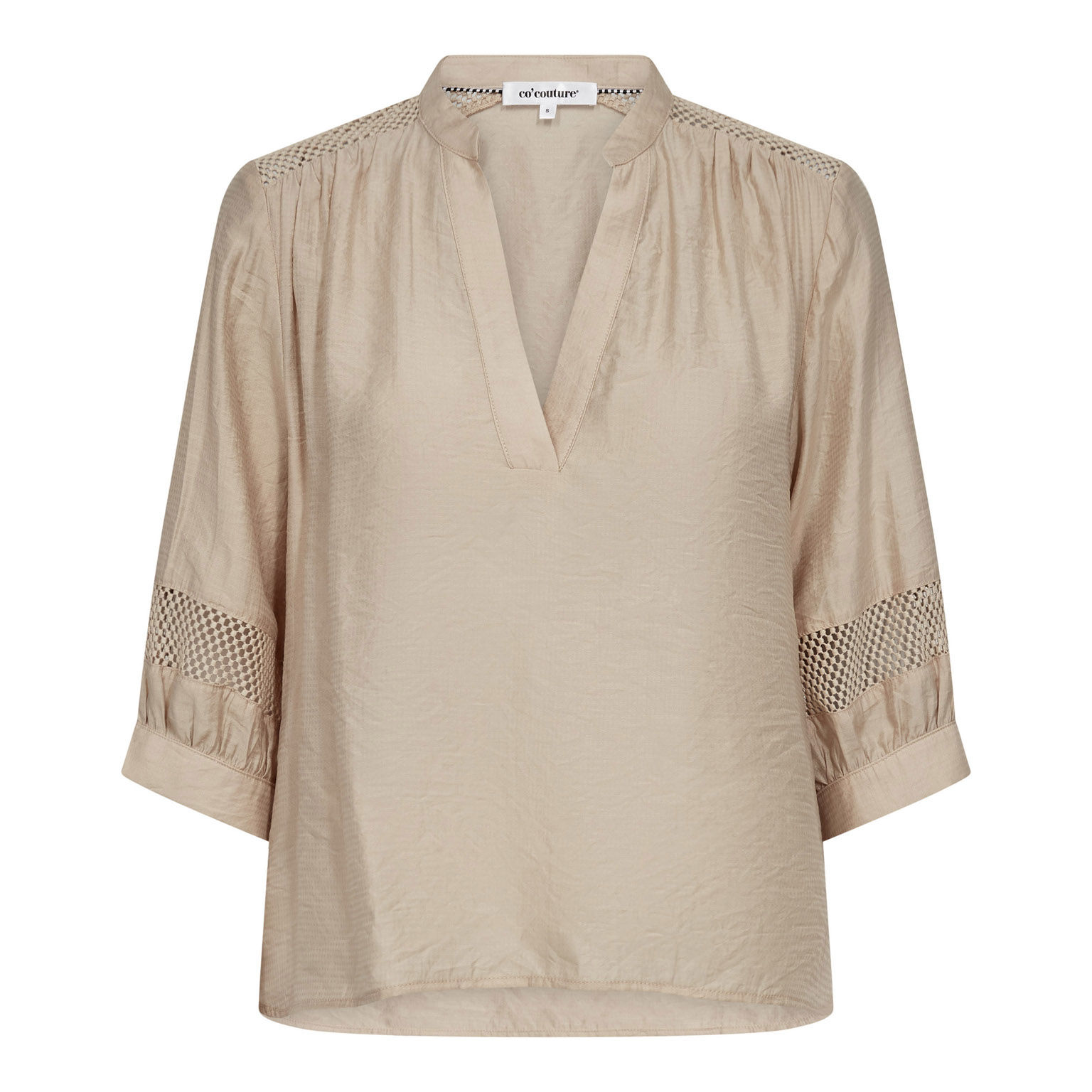 Virkelig flot nyhed fra Mos Mosh i en elegant beige nuance med fine detaljer, blandt andet et dekorativt hulmønster, der giver et let og feminint udtryk. Modellen har 3/4-lange ærmer og en klædelig V-udskæring, som fuldender det stilrene look.