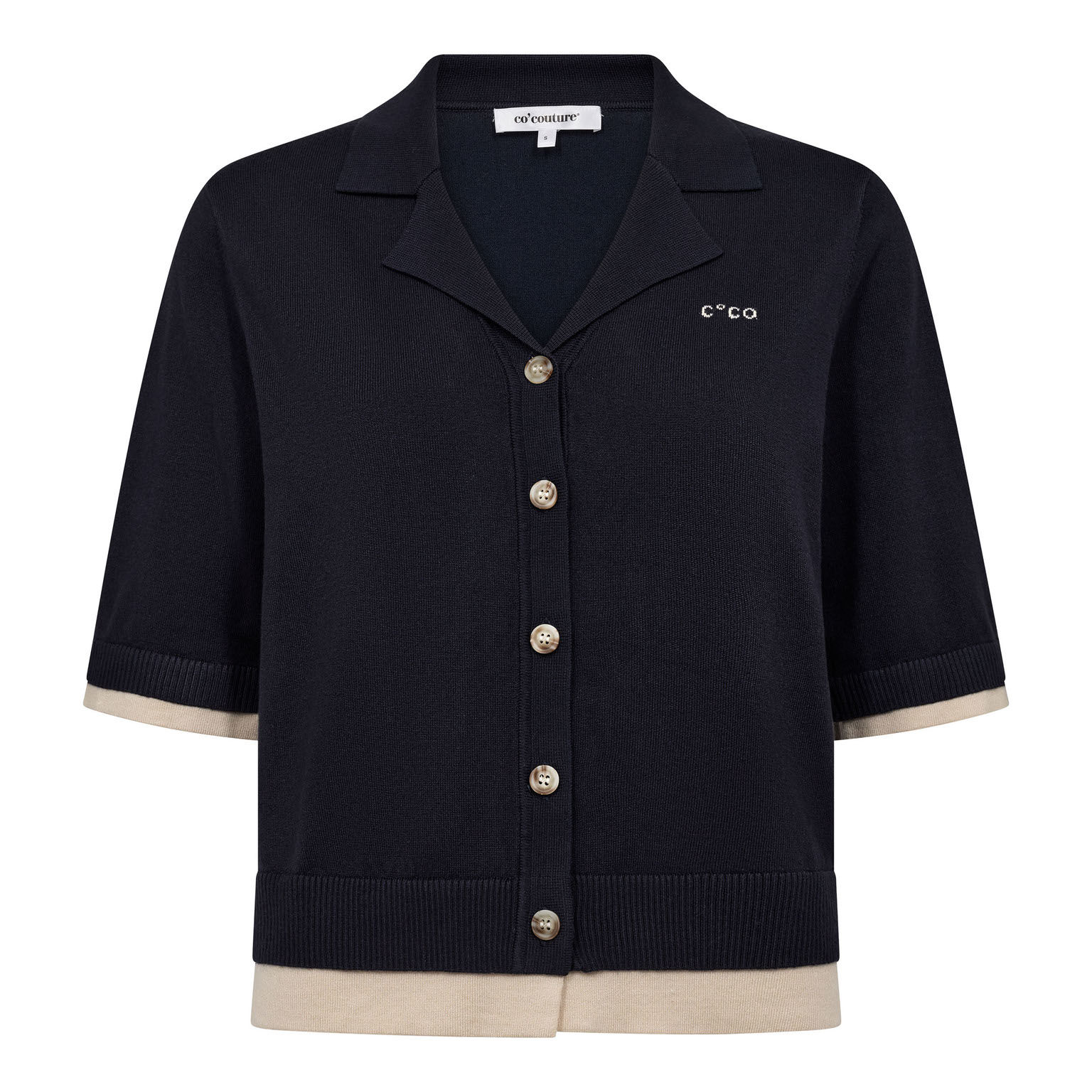 En stilren cardigan i navy fra Co’Couture, der giver et klassisk look med fine kontrastdetaljer. De korte ærmer og polo-kraven tilfører et moderne twist, mens den beige kant ved ærmer og nederst skaber et elegant finish. Den gennemgående knaplukning og det lille CC-logo på brystet fuldender udtrykket, og den bløde viskose gør den behagelig at have på hele dagen. Brug den lukket som top eller åben over en kjole eller T-shirt. Kig forbi butikken i Stenløse eller bestil den hjem i dag og få en alsidig favorit til garderoben.