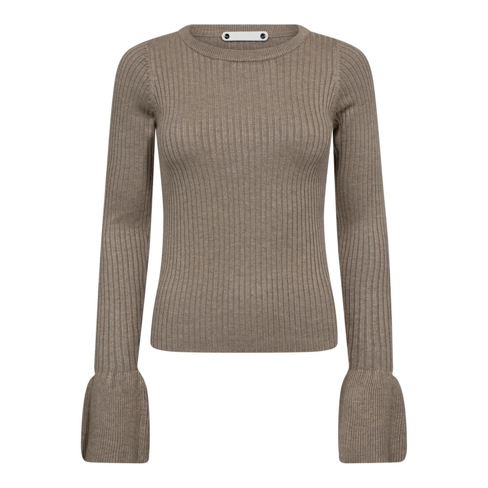 Flot strik fra Co' Couture med en lækker ribstrikket kvalitet og en blank overflade. Denne strik har en rund hals med ribkant samt lange ærmer, der udformes med brede flæsemanchetter.