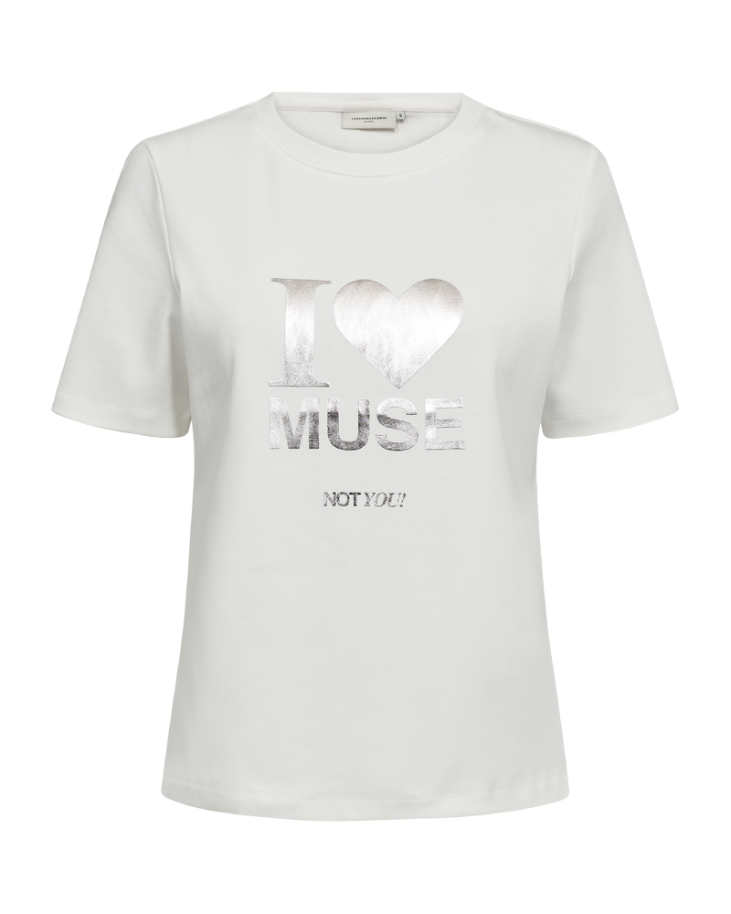 Flot T-shirt fra Copenhagen Muse i en eksklusiv kvalitet. T-shirten er enkel i modellen med et fint sølv print foran.