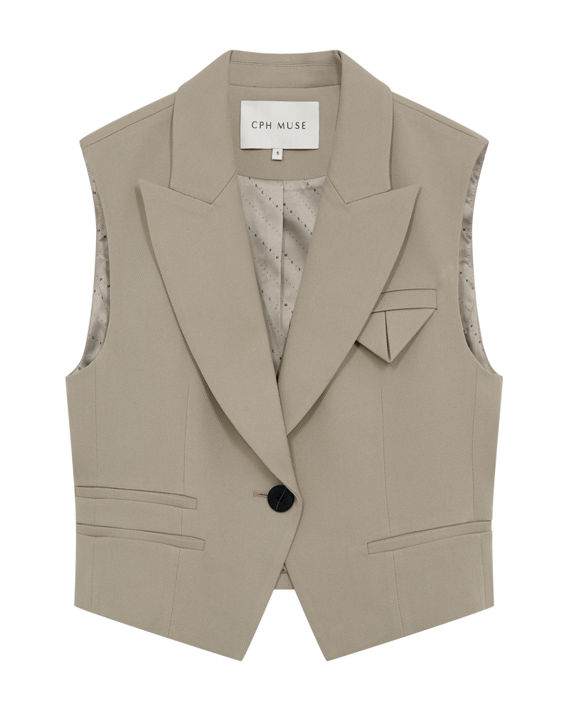 En elegant, skræddersyet vest i en flot vævet kvalitet med let struktur. Den har brede skuldre og en flot reverskrave, som giver et moderne udtryk. Det ærmeløse design fremhæver skuldrene, mens den enkle knaplukning holder looket stilfuldt. Bagpå kan pasformen justeres.