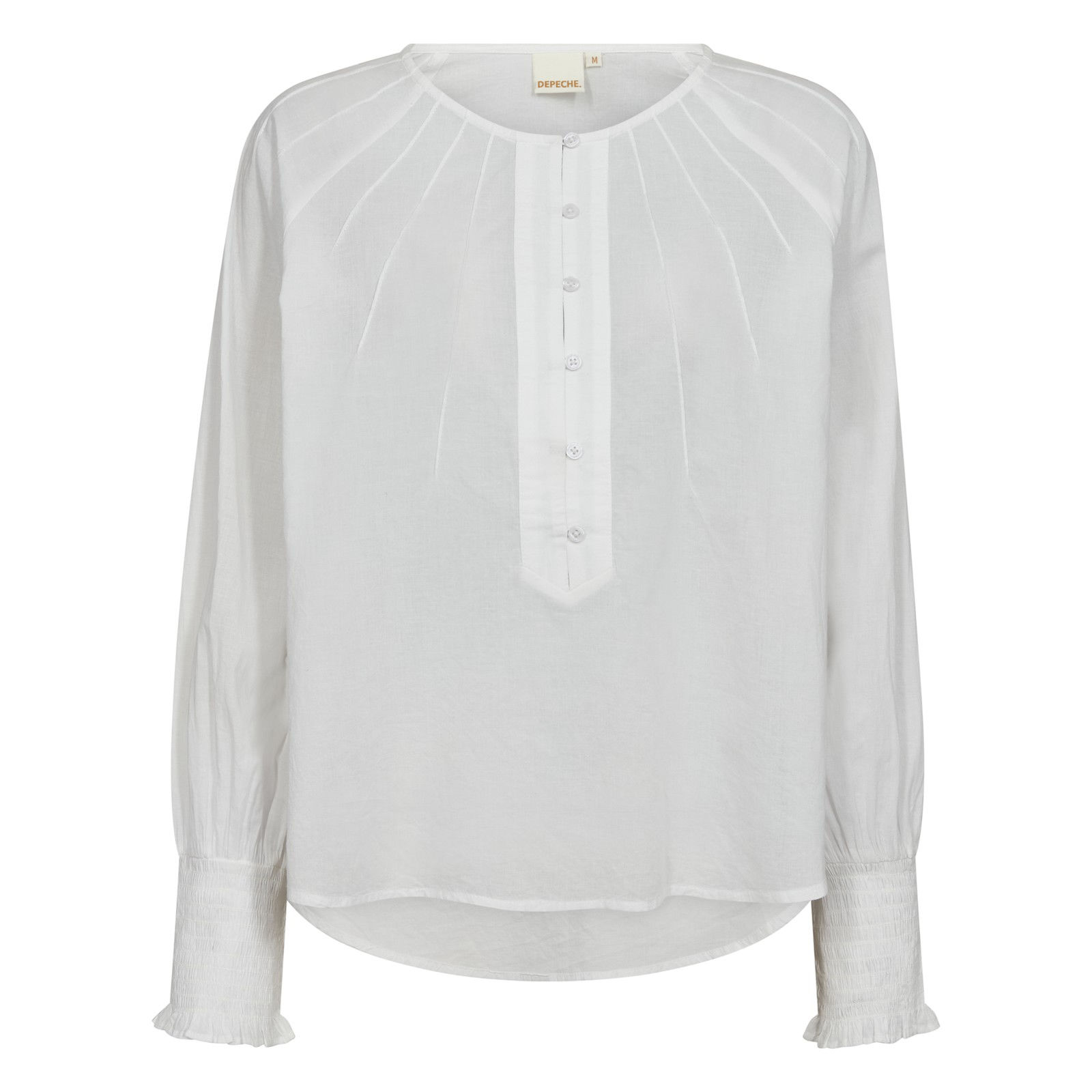 Blusen har knapper foran som en fin og feminin detalje, lange ærmer med smock ved ærmekanten, der giver et blødt, afslappet udtryk. Det gør blusen ideel til alt fra kontorlooks til middag med veninderne.