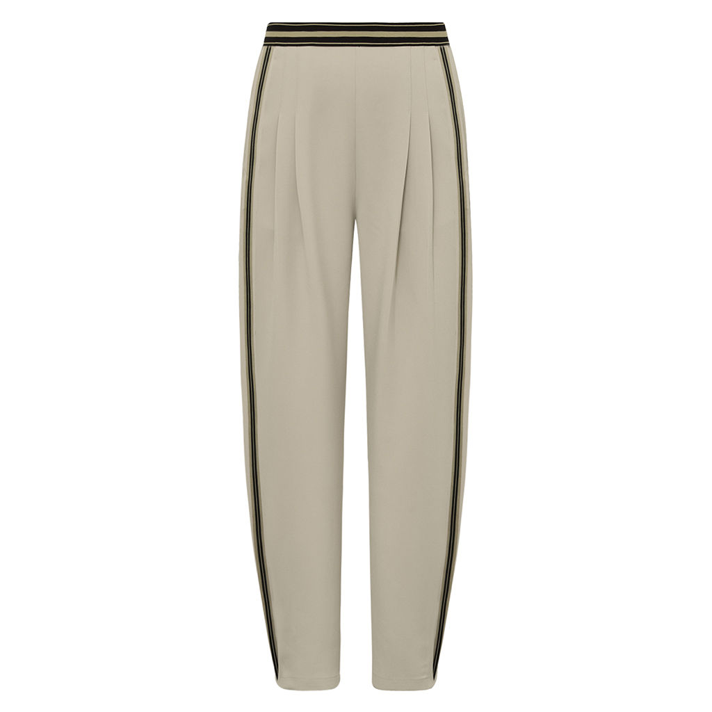 Lækker og sporty buks med en afslappet pasform. Denne buks har elastik i taljen med en stribet kant. Buksen har også en stribet kant ned langs benene, som bidrager til et sporty design. Buksen er designet med små læg øverst ved taljen, hvilket er med til at give en flot pasform. Bukserne har en lidt løsere pasform i lårene, der taper ind mod anklerne.
