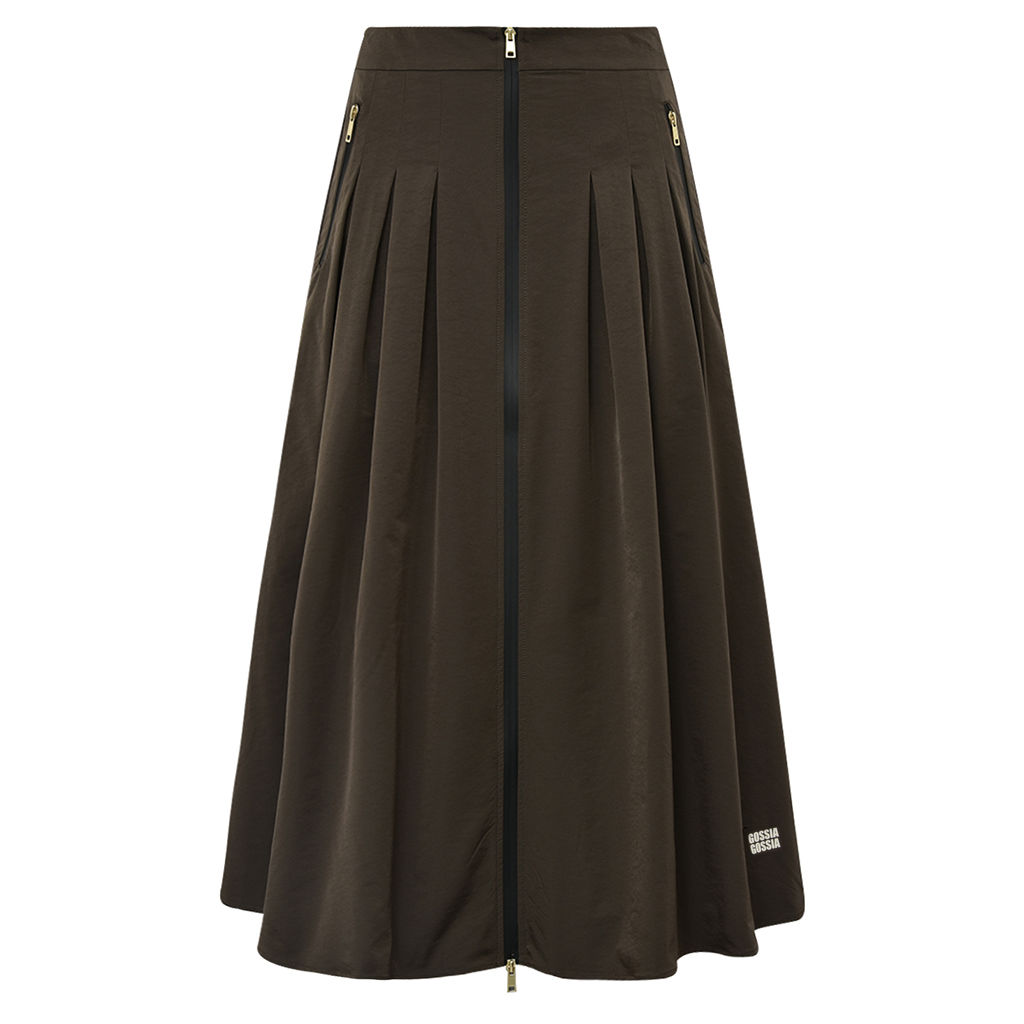 Cool nederdel fra Gossia i mørkebrun. Nederdelen har flotte fald foran samt lukkes med lynlås langs fronten. De praktiske lommer og læg i taljen giver både en flot figur og et afslappet, cool udtryk.