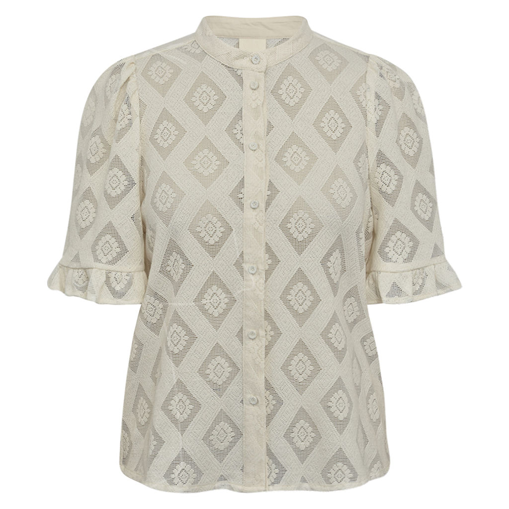 En smuk, semi-gennemsigtig skjorte i jacquard mesh, der giver et eksklusivt og feminint udtryk. De små pufærmer og fine flæsedetaljer på ærmerne gør skjorten til noget helt særligt.