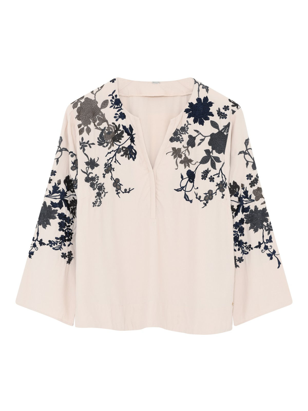 Pæn bluse fra Gustav med lange ærmer og rund hals med v-udskæring. Blusen har løse ærmer samt det fineste broderet mønster.
