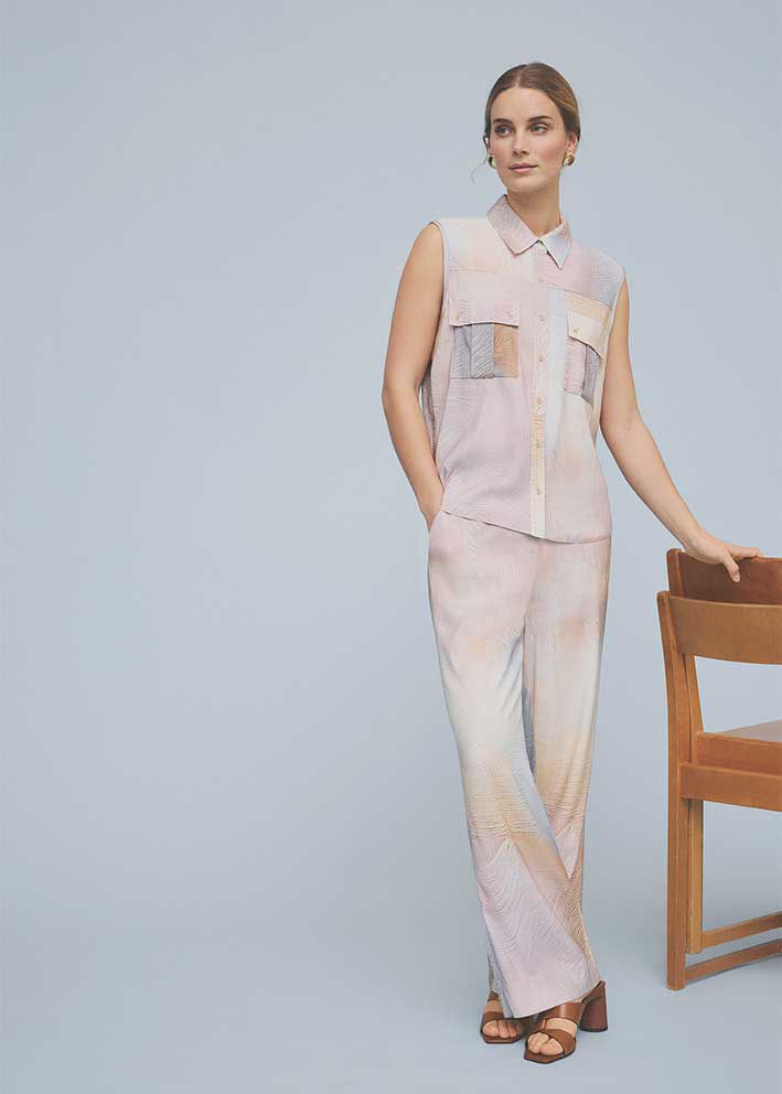 Bali wide leg bukserne fra Gustav er et par lette og behagelige bukser med brede ben, der falder flot og giver et afslappet, men stadig elegant look. De fine beige og lyseblå farver giver et frisk sommerudtryk, og den bløde kvalitet med lidt stræk gør dem rare at have på hele dagen. Style dem med Ilona skjorten i samme print eller en enkel top. Samme print findes også som kjole.