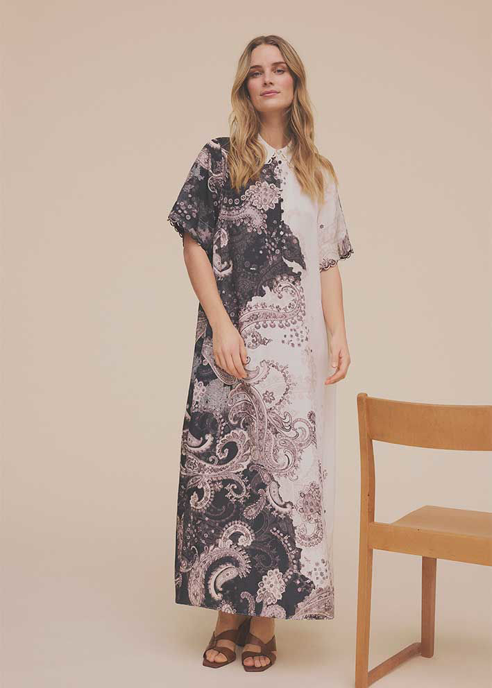 Anika fra Gustav er en lang, elegant kjole, der kombinerer et feminint udtryk med et moderne grafisk print i sort og creme. Det tidløse design gør den nem at style til både festlige lejligheder og afslappede dage, hvor du stadig ønsker et sofistikeret look. Kjolen er lavet i en blød og let kvalitet af cupro og viskose, som giver et smukt fald og en behagelig komfort hele dagen. Printet findes også som overdel.