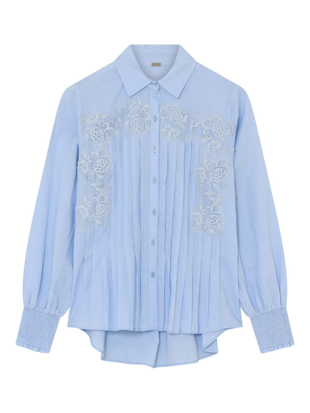 Fin skjorte fra Gustav med de flotteste blonder og plisserede detaljer. Skjorten har lange ærmer, en klassisk krave samt en smock for enden af ærmerne.