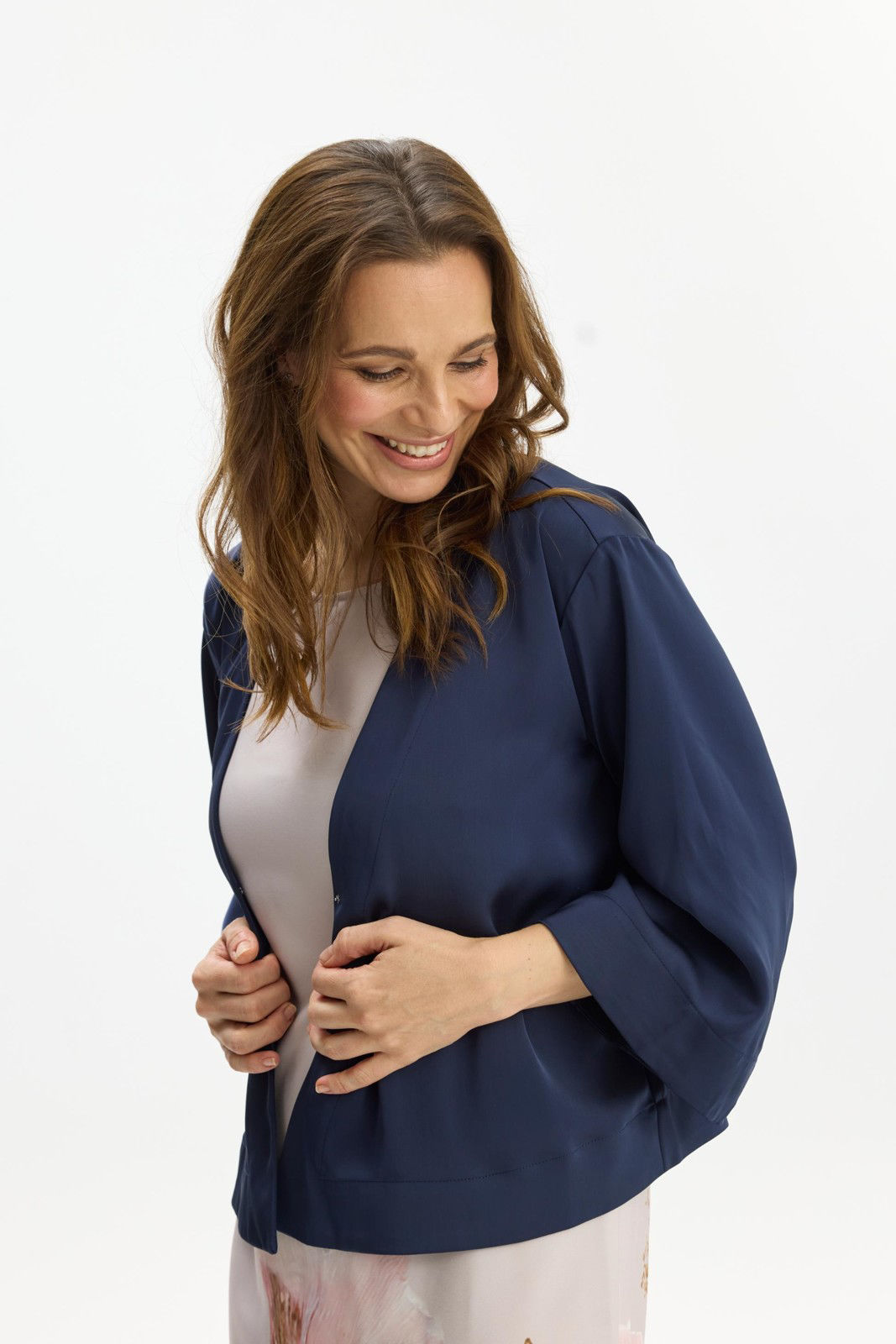 Åben Alexandra-jakke i let og behagelig kvalitet med Komono-model, der giver et afslappet og moderne look. Jakken har en flot mørkeblå farve, som er super alsidig og nem at style til både hverdag og mere festlige outfits. Perfekt som let lag til forårs- og sommerdage, hvor du ønsker et tidløst og stilrent touch til garderoben.