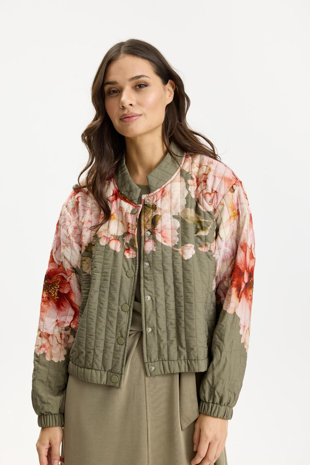 De smukkeste quiltede jakker er landet fra danske In Front – er de ikke skønne? Den grønne model har et flot blomsterprint både foran og bagpå, som giver et feminint look. Jakken har en lille krave i halsen og lukkes med knapper foran. Elastisk afslutning forneden og ved ærmerne. Behagelig pasform. Indvendigt er den foret med et fint og let foer.