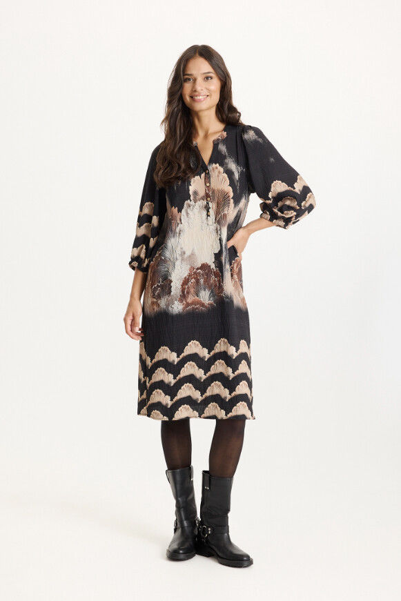 Flot kjole fra In Front med ¾ lange ærmer, rund hals med v-udskæring og et super smukt print.