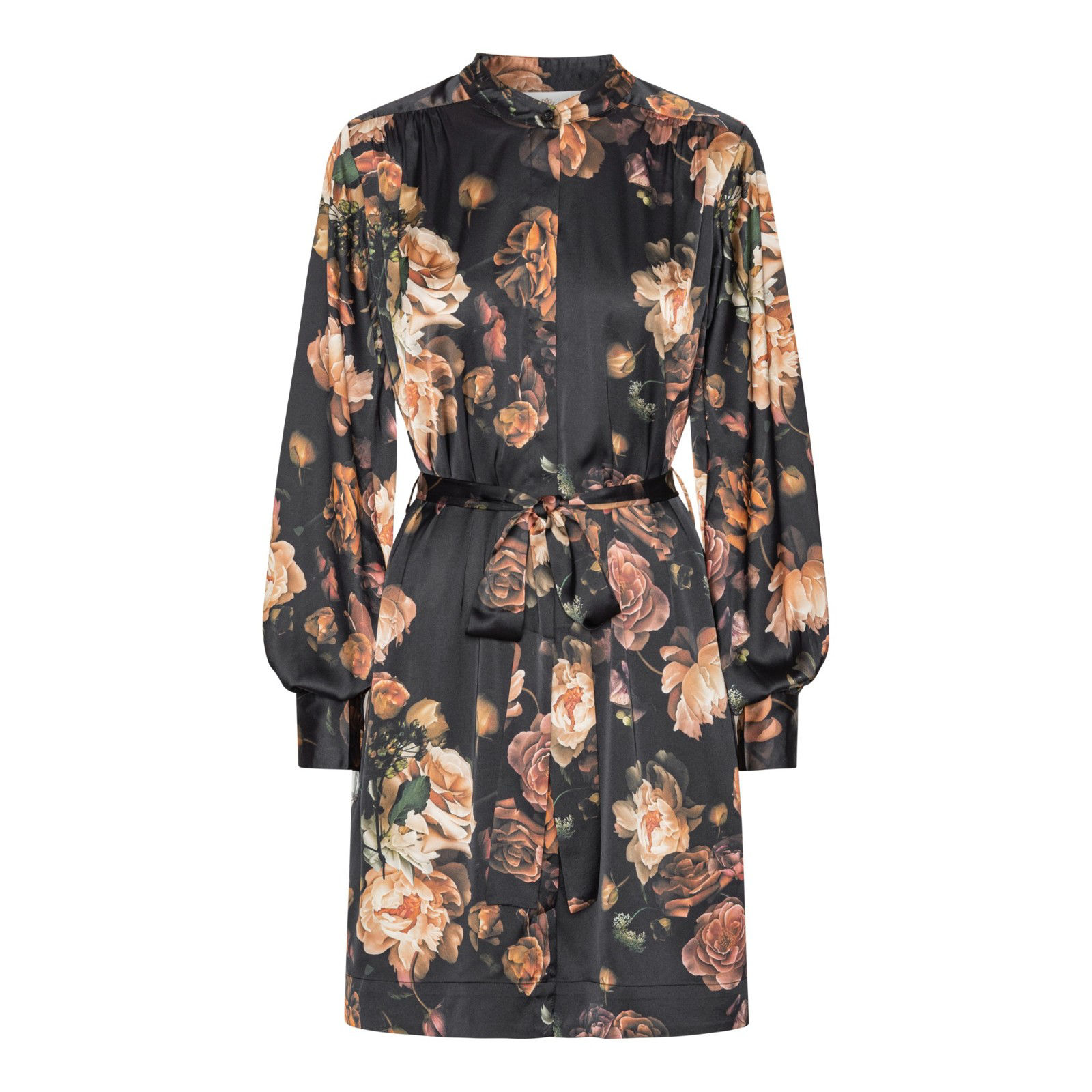 Super smuk og klassisk mellemlang skjortekjole fra Karmamia med kina krave i et smukt print. Kjolen kan bæres med eller uden bælte.
