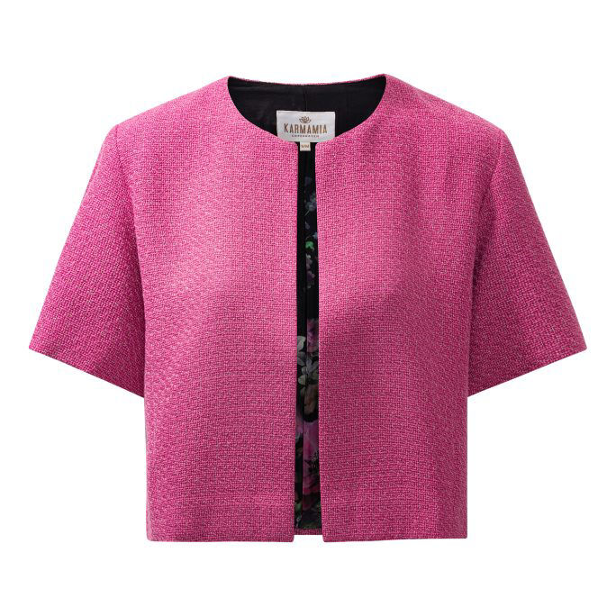 Elegant, kort jakke fra Karmamia med rund hals, 3/4-lange ærmer og åben front. Perfekt til at have udover din yndlingsbluse