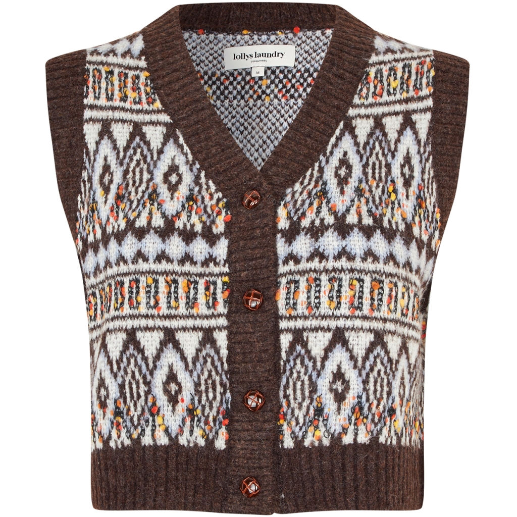 Komfortabel og retro strikket vest med et karakteristisk mønster og farverige detaljer. Designet i en varm brun bund med kontraststrik i off-white og flerfarvede nitter, giver den et retro-inspireret præg. Den cropped silhuet og de brede ribkanter giver den en moderne form, mens V-halsudskæringen og de dekorative knapper fuldender looket.