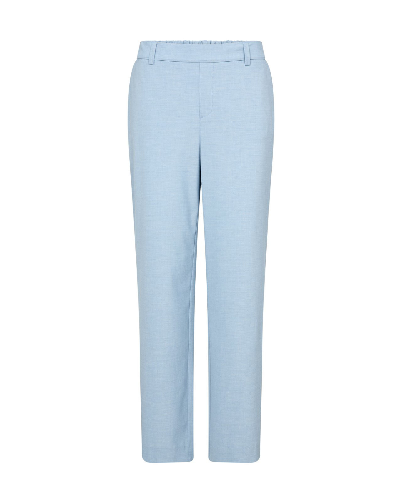 Smukke lyseblå bukser fra Mos Mosh med lige ben med vidde og falder smukt. De har stiklommer i siderne, snydegylp på fronten og paspolerede lommer bagpå. Derudover har de elastikkant bagpå taljen samt bæltestropper.