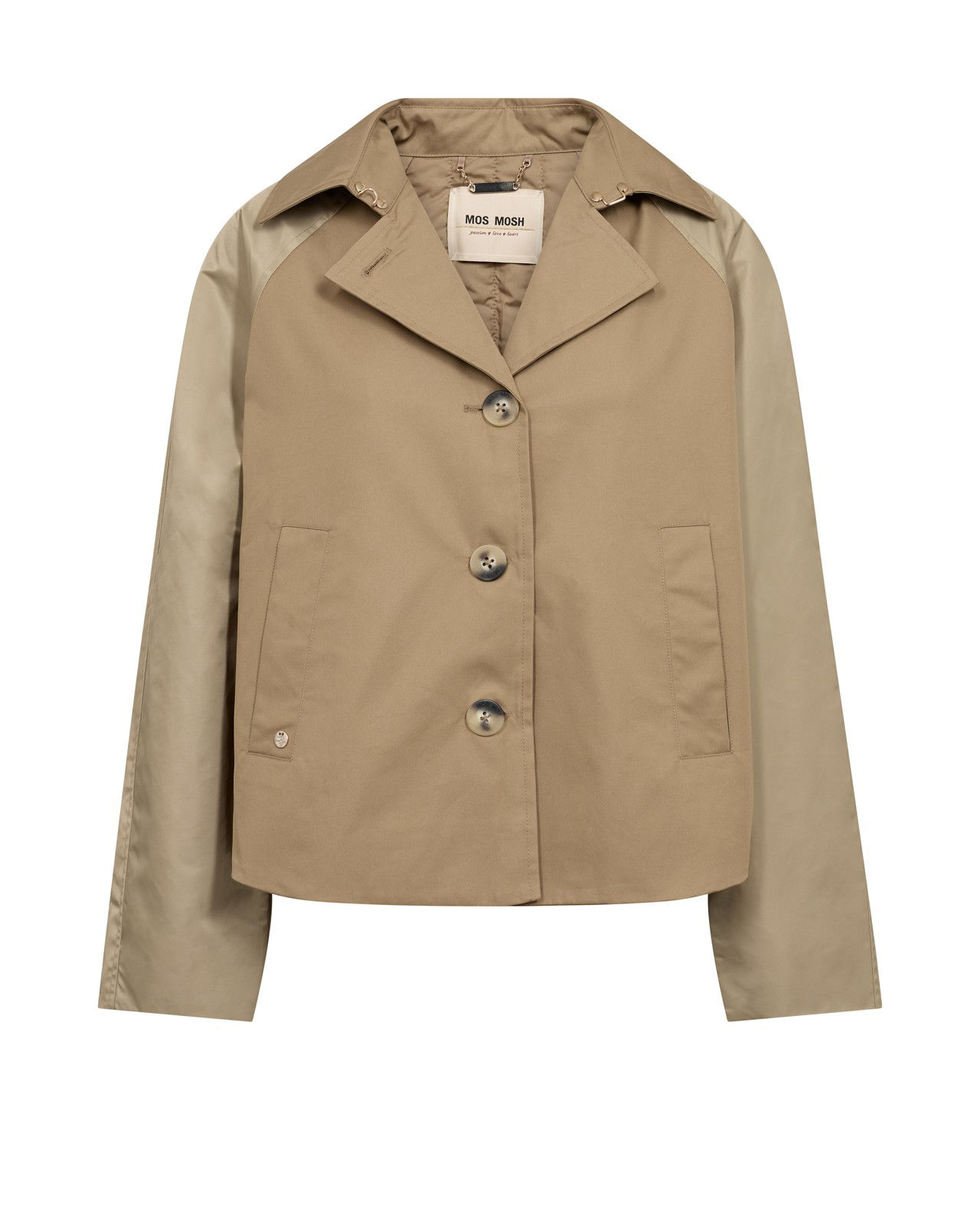 Flot Jakke fra Mos Mosh som er designet med en let cropped silhuet. Denne trenchcoat har desuden knaplukning og lange ærmer.