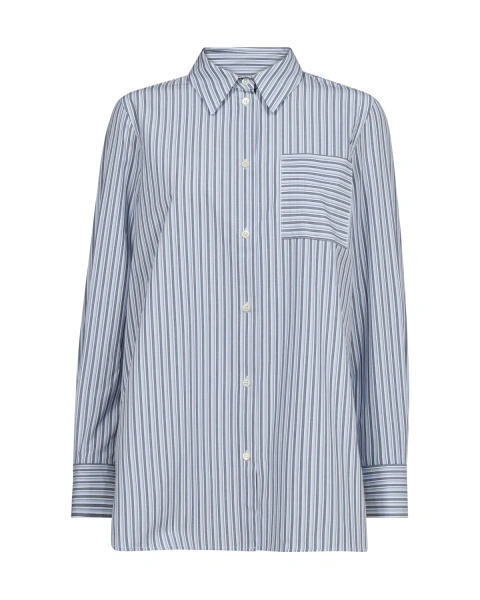 Cool skjorte med striber fra Mos Mosh, som har en klassisk krave, afrundede slidser samt en brystlomme med vandrette striber, der skaber en kontrast til de ellers lodrette striber. Skjorten har lyse knapper og lange ærmer, der afluttes med knapmanchetter.