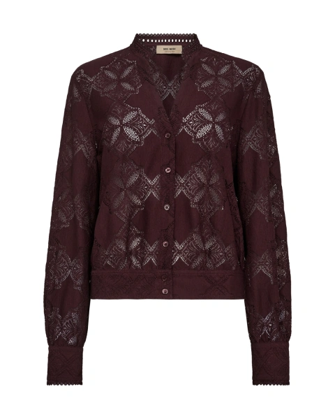 Elegant blondeskjorte fra Mos Mosh med lange ærmer, brede manchetter og kinakrave i halsen. Skjorten har også små knapper langs fronten og den smukkeste kvalitet.