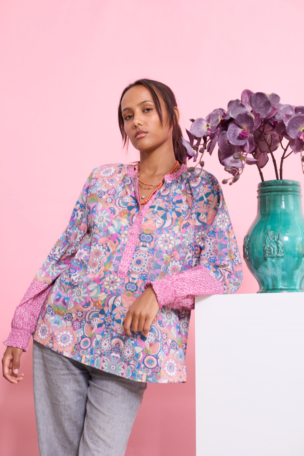 En farverig skjorte fra vores nye mærke Michalawiesneck, der giver masser af personlighed til dit look. Det flotte multi print i farverige nuancer gør den til et iøjnefaldende, men stadig nemt stylebart stykke tøj. Modellen er oversize og luftig. Den runde hals har en stolpelukning med seks knapper øverst, hvor stoffet i stolpelukningen og halsen er anderledes end resten af modellen – det giver en cool detalje. De lange ærmer afsluttes med smock-elastik, som giver en let puffet effekt. En skjorte, der kombinerer komfort og farver på bedste vis. Kig forbi os i Stenløse eller gør den til din egen online i dag.