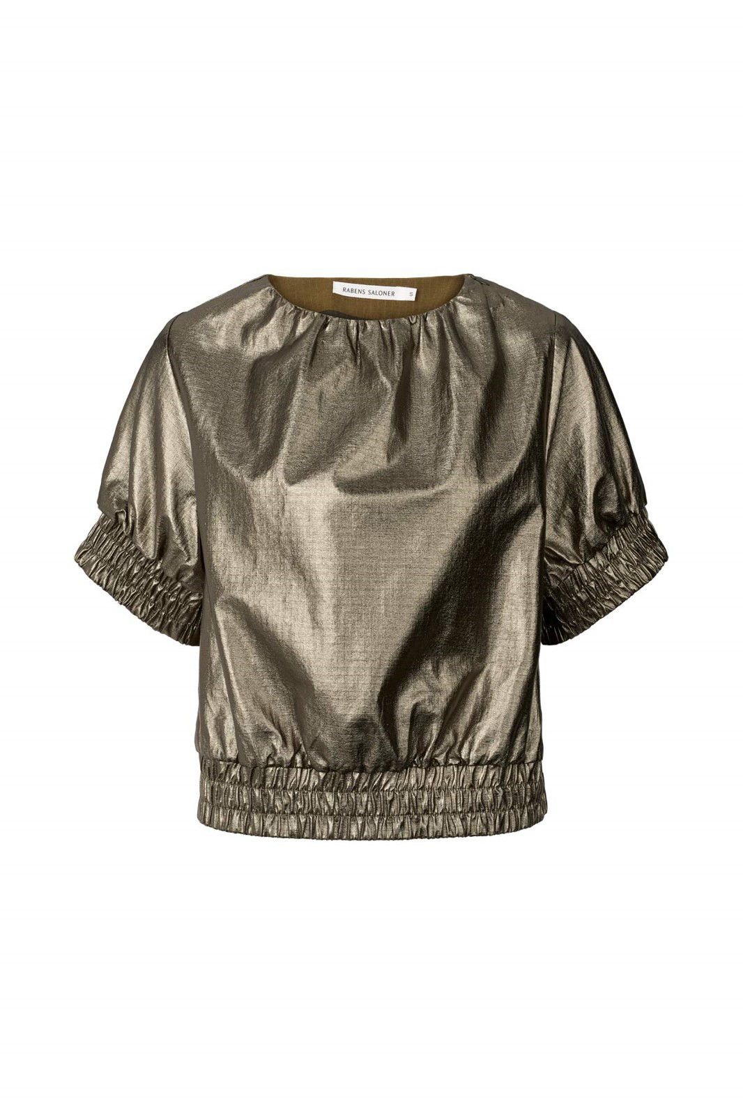 Metallic, coated overdel fra Rabens Saloner, som er cool og sporty på samme gang. Denne overdel kan både bruges til festlige lejligheder og i hverdagen med et par jeans til. Den har rund hals med let rynk samt blød elastikkant ved ærmer og forneden