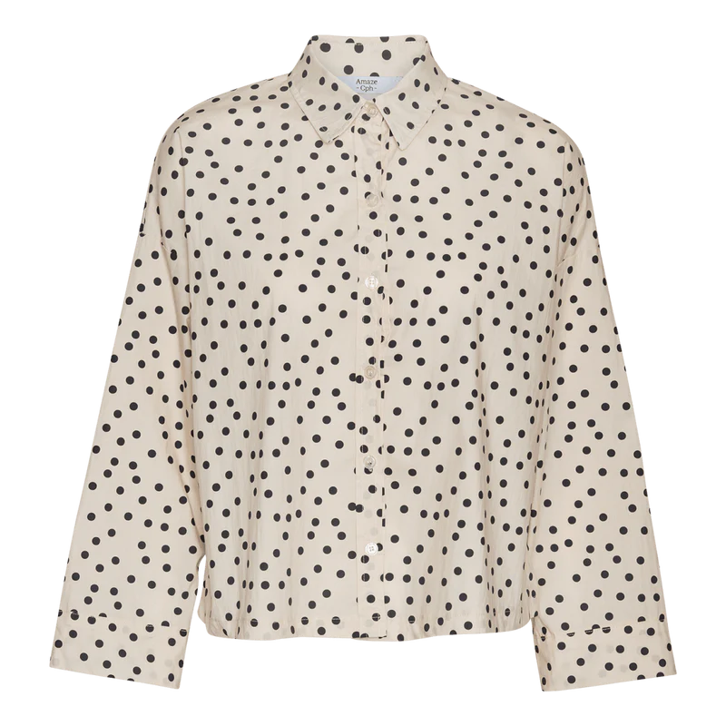 Fin skjorte med klassisk krave og knaplukning foran. Modellen er i offwhite med sorte prikker, som giver et tidløst og stilrent udtryk, der er nemt at style til både jeans, bukser eller nederdel. En let og alsidig skjorte, der passer perfekt til både hverdag og pænere brug – og så er den til en rigtig god pris. Findes i flere farverhvis du er hurtig.