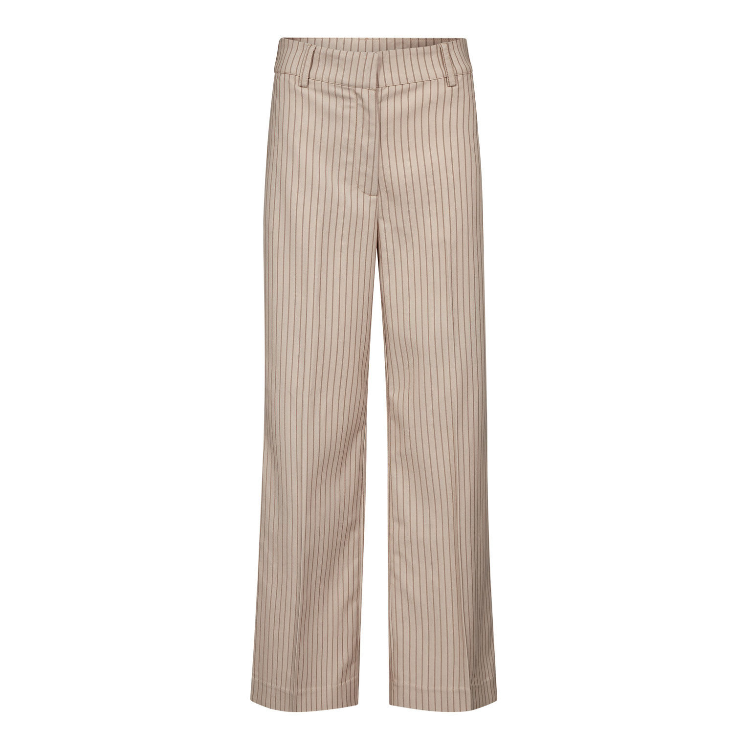 Stilfulde bukser fra Co’Couture i en lys beige farve med elegante lodrette striber. Den løse pasform giver et moderne og behageligt look, der både er elegant og let at style. Bukserne har bæltestropper og lukkes foran med knap og lynlås.Elastik i lænden. Smuk lang model.