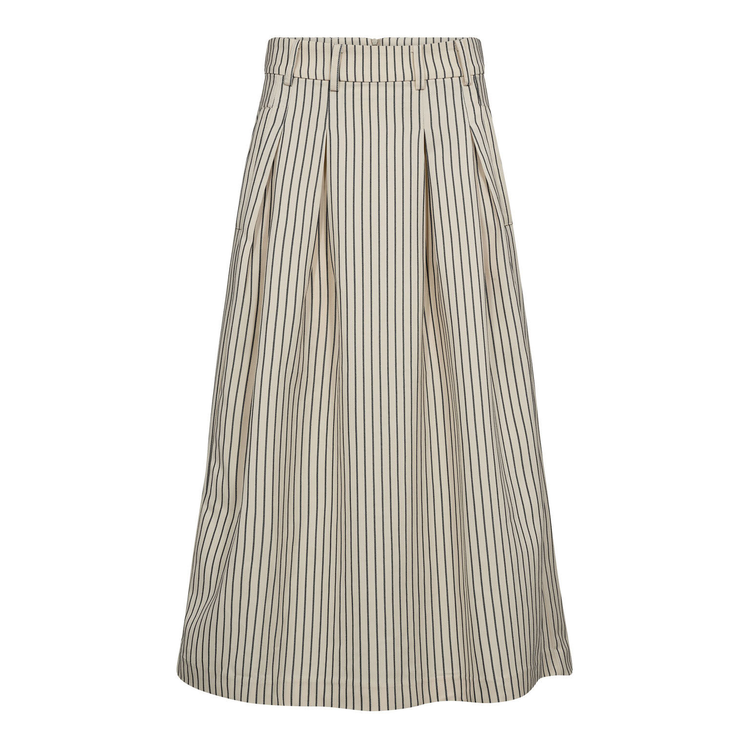 Off-white nederdel fra Co Couture med lodrette sorte striber. Nederdelen har læg foran og bæltestropper der giver et moderne og stilrent udtryk. En diskret lynlåsdetalje i taljen.