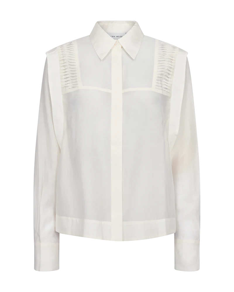 En skjorte der giver et elegant og gennemført udtryk – denne model har en smuk, ren front med skjult knaplukning, der lader detaljerne tale for sig selv. De fine plisseringer over skuldrene skaber en feminin silhuet og tilfører lidt ekstra både foran og bag på, mens de lange ærmer med cuffs fuldender det klassiske look. Perfekt både til arbejde, pænere hverdage og fest. Find den i vores butik i Stenløse eller shop den online.