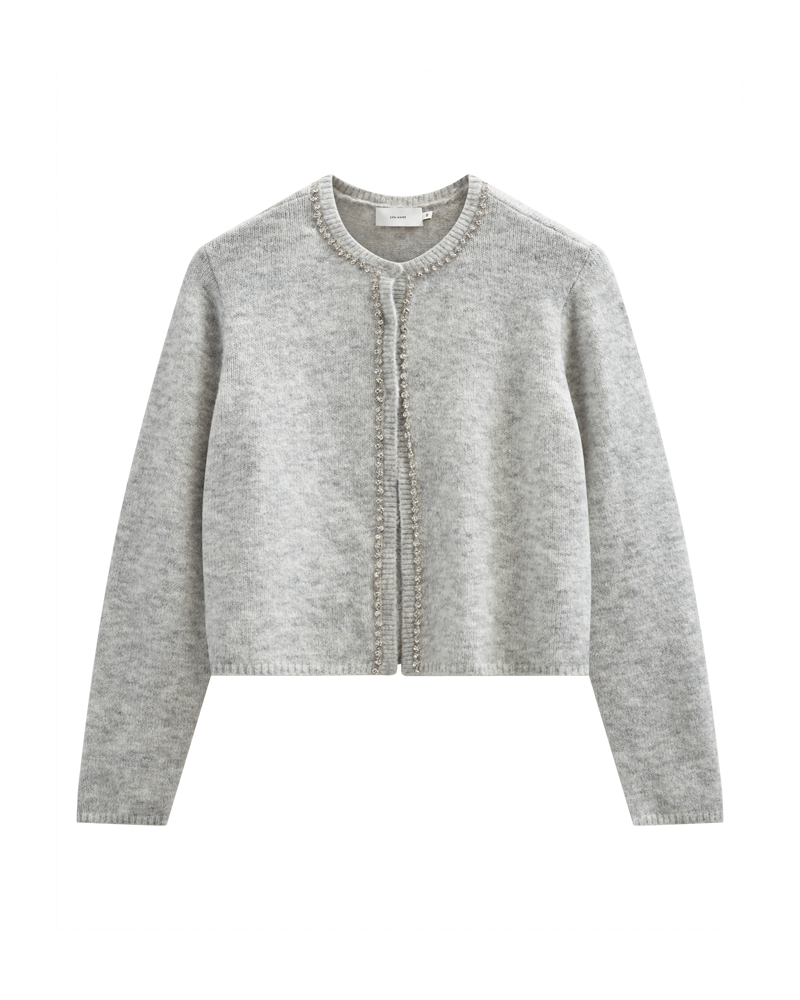 Flot kort, vidde cardigan i en eksklusiv, strikket kvalitet med lange ærmer, en skjult trykknaplukning i toppen, smalle ribkanter samt elegante similisten i kanten af halsudskæringen og fronten.