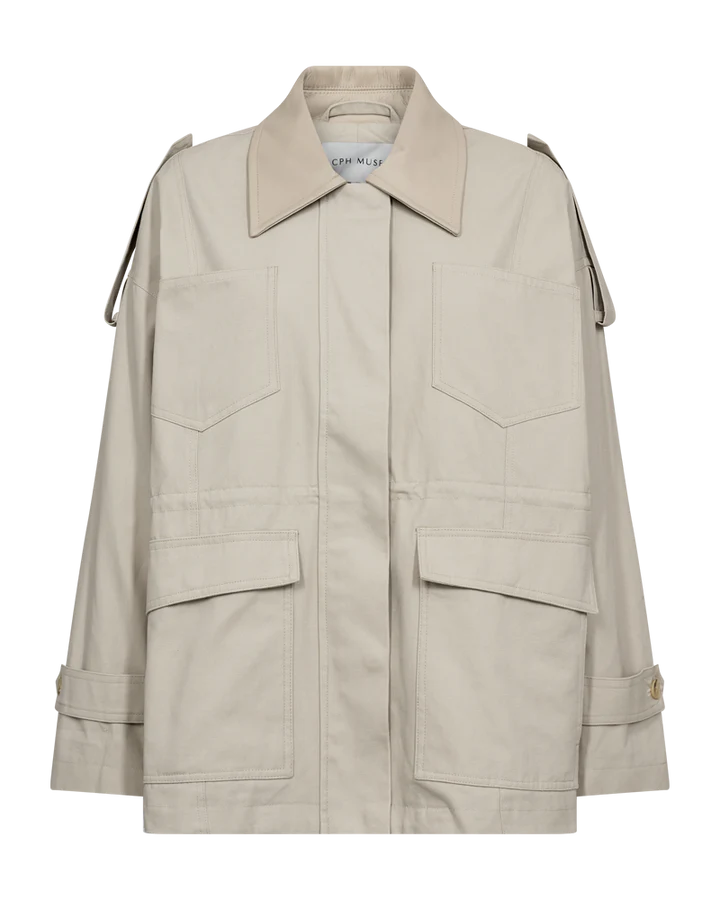 Oversize jakke med justerbar talje, rummelige lommer og rå skulder- og manchetstropper. Den elegante læderkrave giver et stilfuldt kontrastelement. Er den ikke lækker?