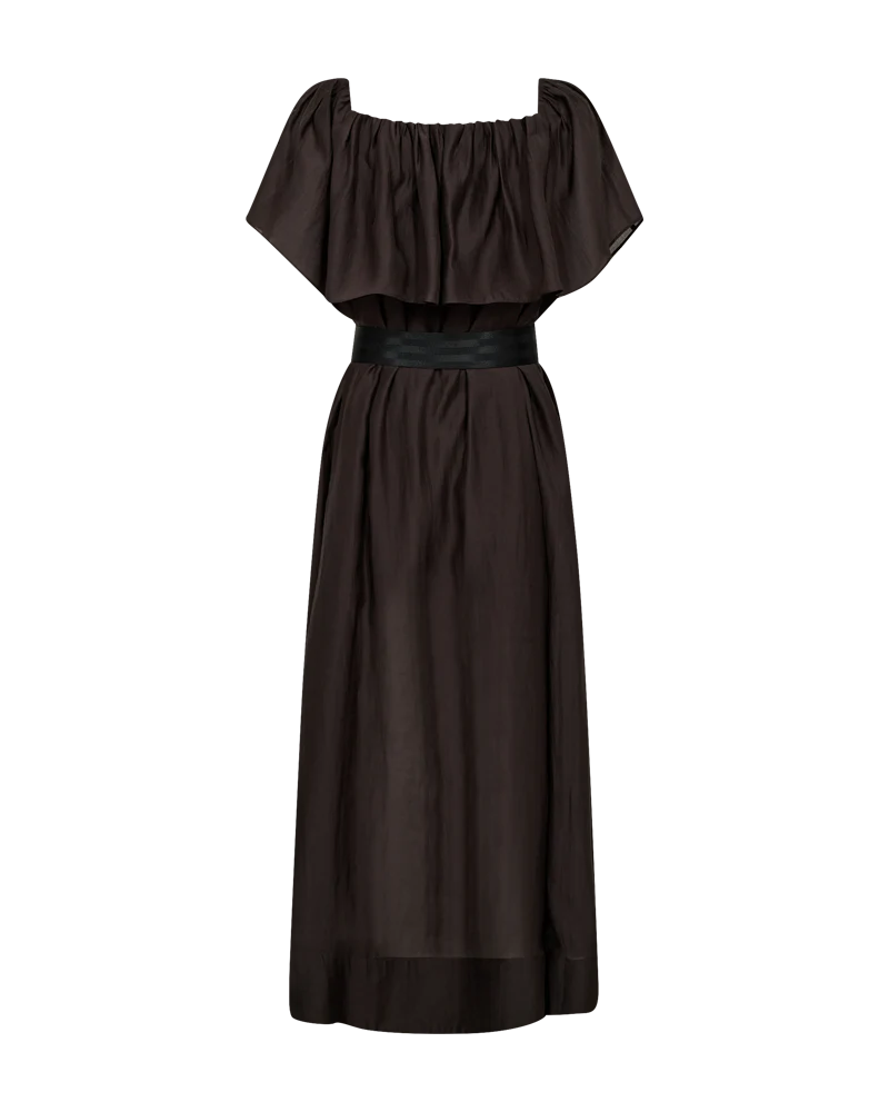 En kjole der både er afslappet og ser fantastisk ud – denne smukke brune model har et feminint udtryk med den brede flæse, der kan bæres off-shoulder og fremhæver skuldrene på fineste vis. Den løse pasform gør den behagelig, mens sidelommerne giver et casual touch, og det sorte bælte med logoprint skaber en flot silhuet. Den høje slids tilføjer bevægelse og lidt kant, så du kan bruge den både til hverdag og særlige anledninger. Prøv den i Stenløse eller bestil den hjem og tag den i brug med det samme.