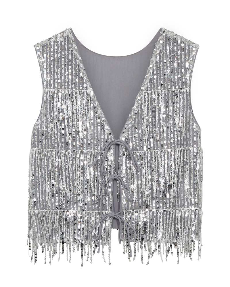 Flot vendbar top fra Copenhagen Muse i en eksklusiv mesh-kvalitet prydet med pailletter med en stilfuld frynseeffekt samt snørelukning.