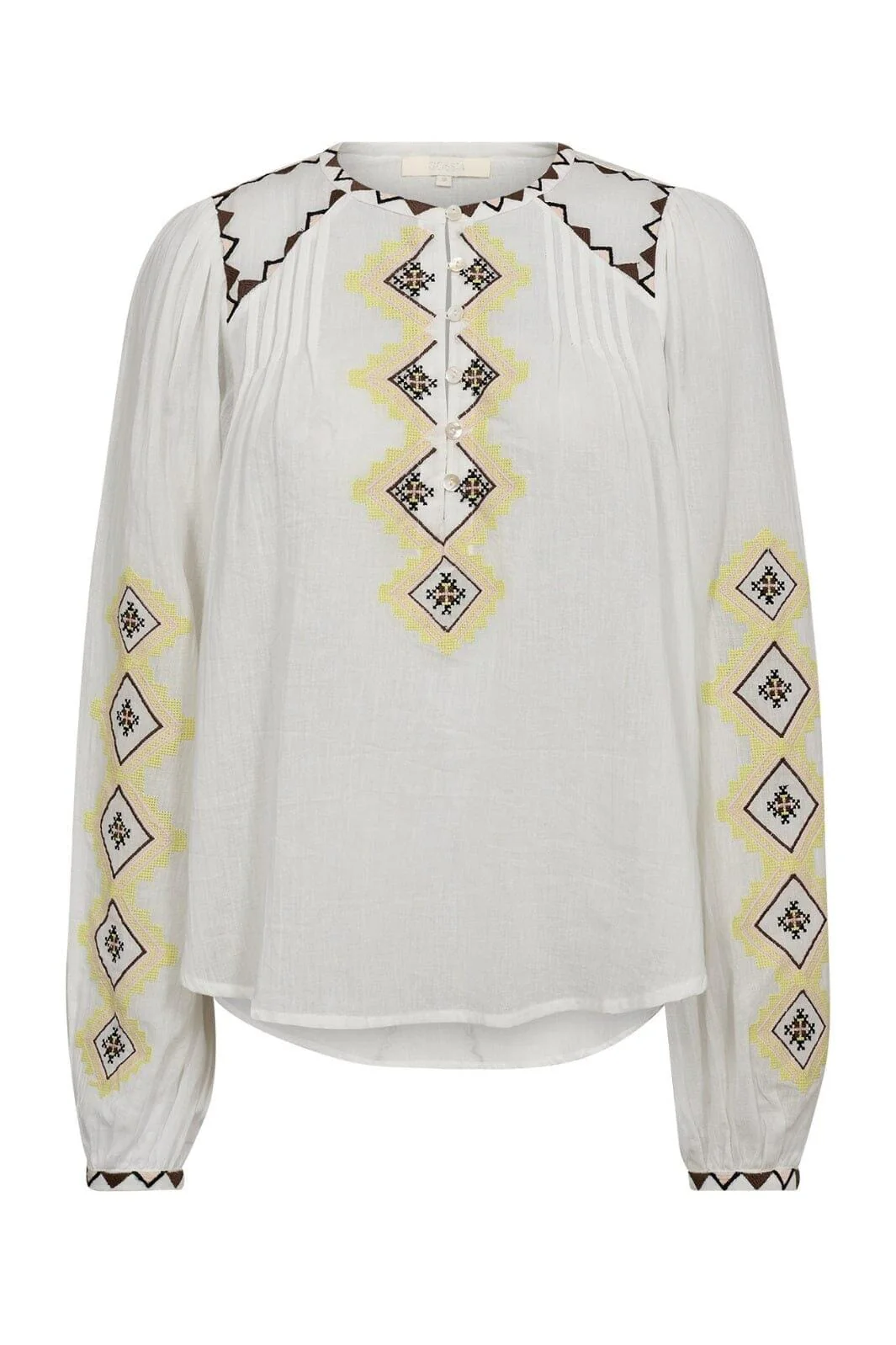En smuk off-white bluse med fine broderidetaljer - er den ikke fin? De dekorative zigzag-broderier i gule, beige og brune nuancer på front og ærmer tilfører liv og karakter, mens den bløde bomuld gør den behagelig at have på. Den runde hals og det enkle snit skaber en afslappet, men stadig feminin stil, som nemt kan bruges til både hverdag og hyggelige sammenkomster. Find den i vores butik i Stenløse eller shop den online i dag.