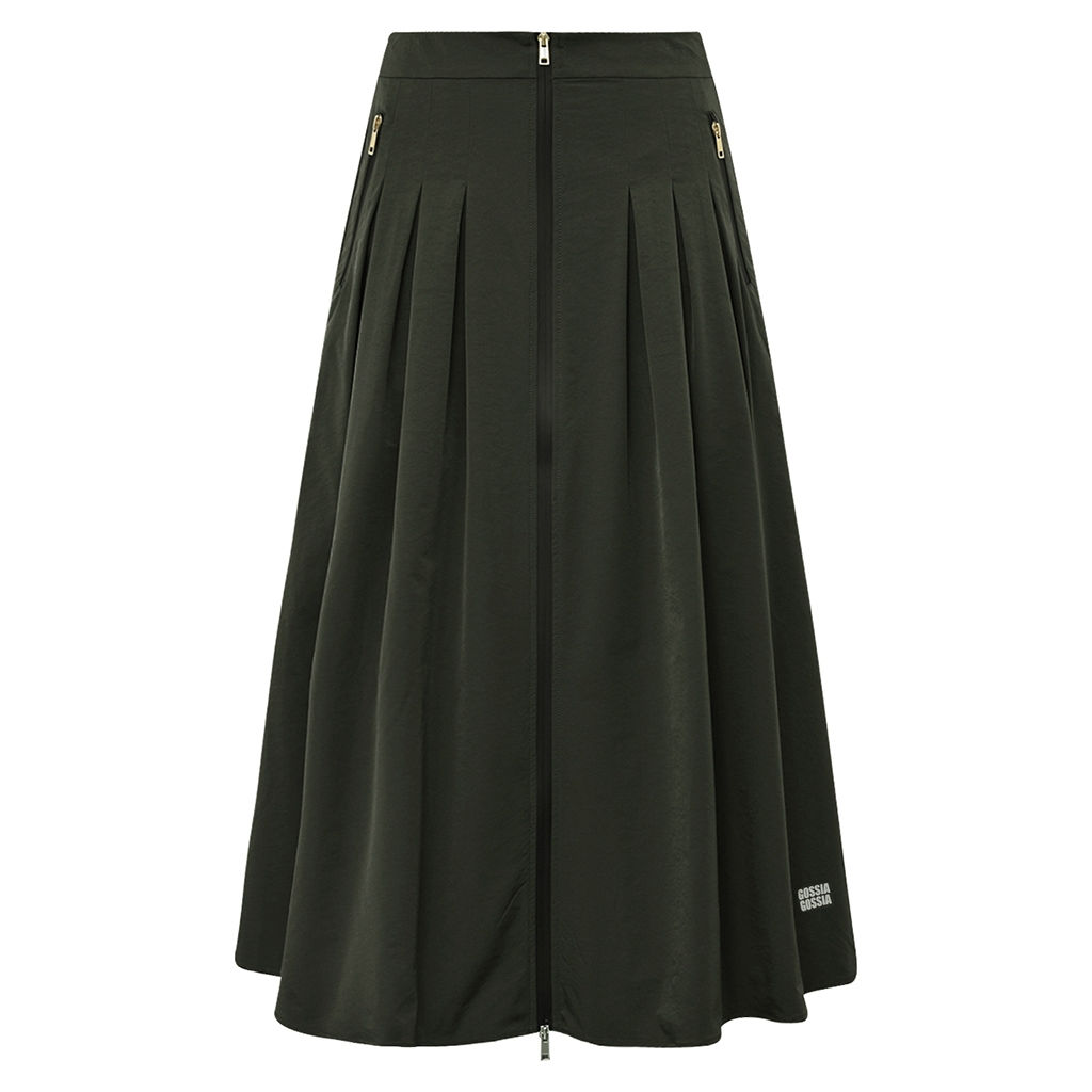 Cool nederdel fra Gossia i army. Nederdelen har flotte fald foran samt lukkes med lynlås langs fronten. De praktiske lommer og læg i taljen giver både en flot figur og et afslappet, cool udtryk.