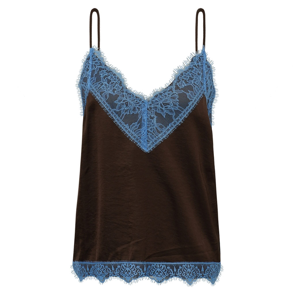 Lækker satintop fra Gossia med smukke blondekanter og justerbare stropper, der understreger det feminine og elegante look. De høje slidser i siderne skaber et moderne og flatterende fald, mens den bløde, glatte kvalitet sikrer et eksklusivt udtryk.