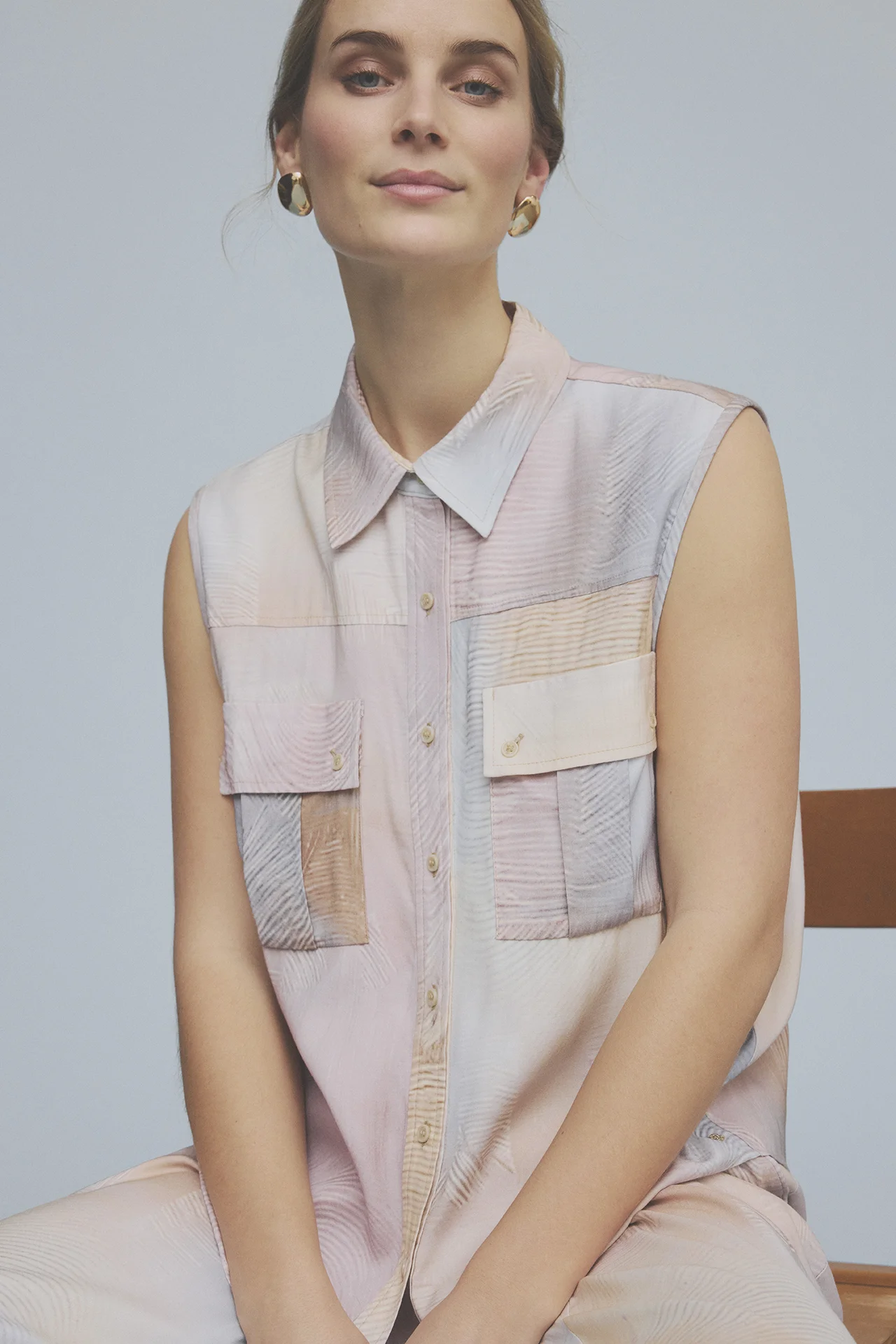 Ilona er en stilren ærmeløs top med et dekorativt mønster i afdæmpede nuancer, som giver et levende men elegant udtryk. Den er designet med klassisk krave og knaplukning hele vejen foran, samt to brystlommer med klap, der tilføjer et afslappet, men gennemført look. Materialet i viskose og elastan føles blødt og har en let fleksibilitet, som sikrer komfort. Den lige kant forneden gør toppen nem at style både løst eller nede i bukser eller nederdel. Printet findes også som buks og kjole.