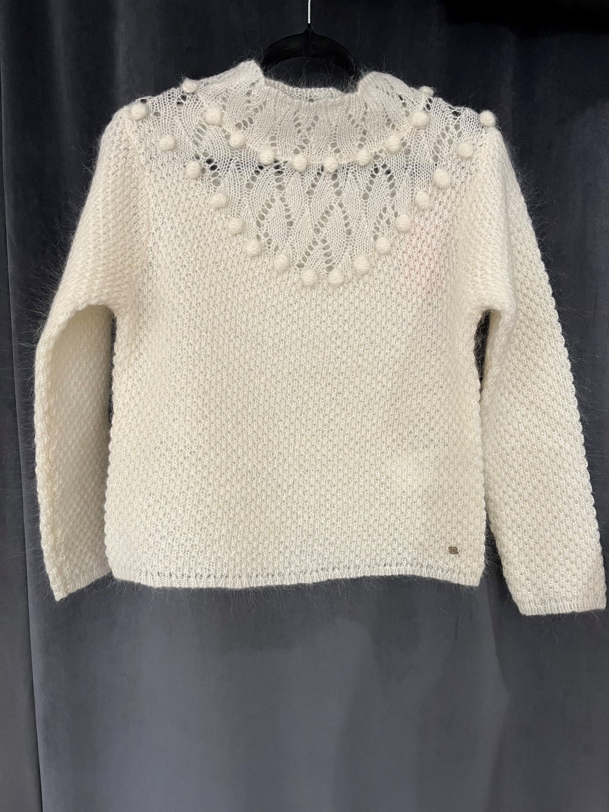 Fin strik fra Gustav med lange ærmer, rund hals samt de flotteste hulmønstre og dekorative detaljer ved foroven.