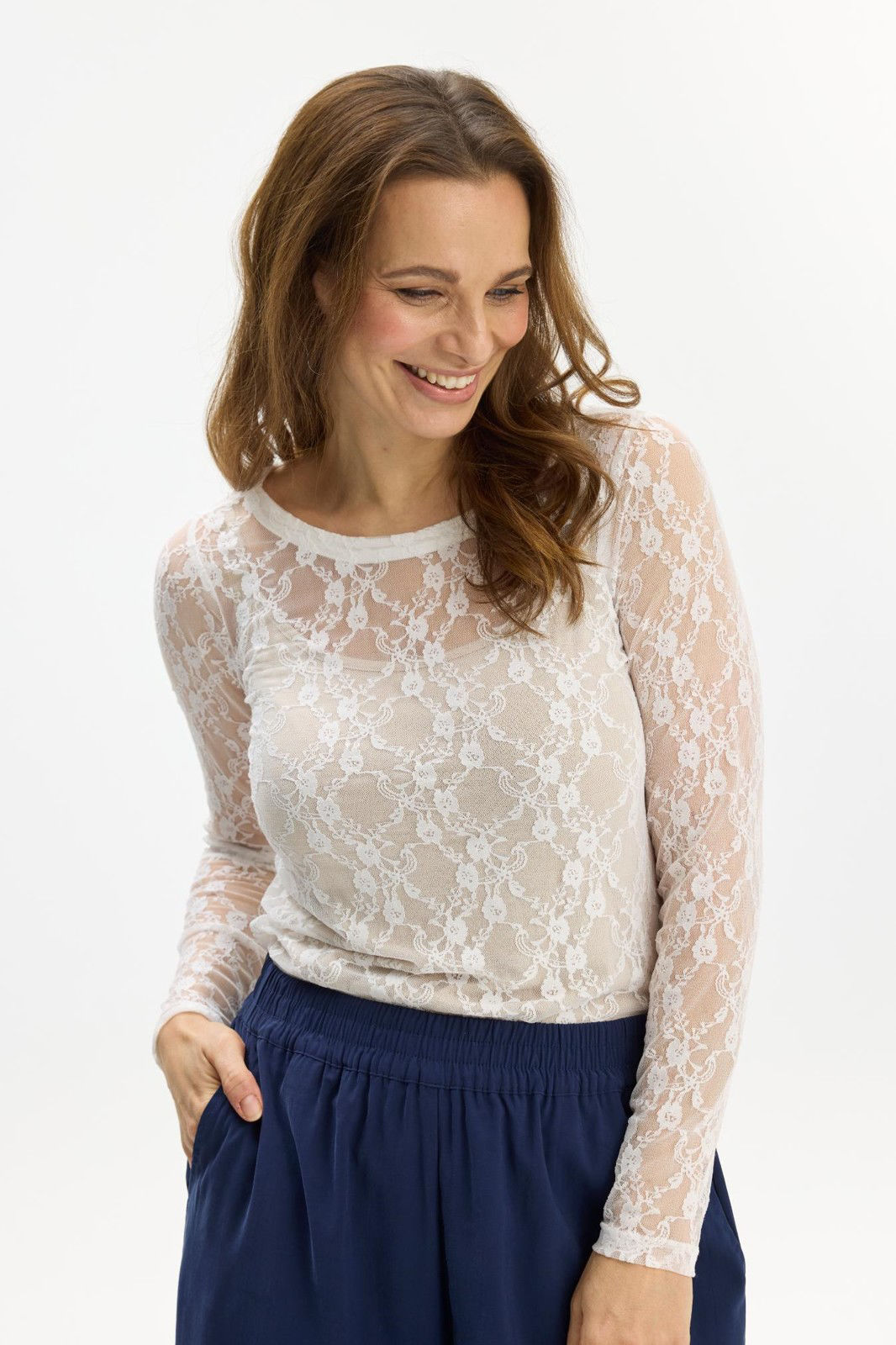Smuk mesh-bluse fra In Front i en feminin og kropsnær pasform. Blusen er lavet i en let ogbehagelig blondekvalitet, der giver et let gennemskinneligt look. Perfekt til at style over en top eller som et delikat lag under en bluse eller kjole.