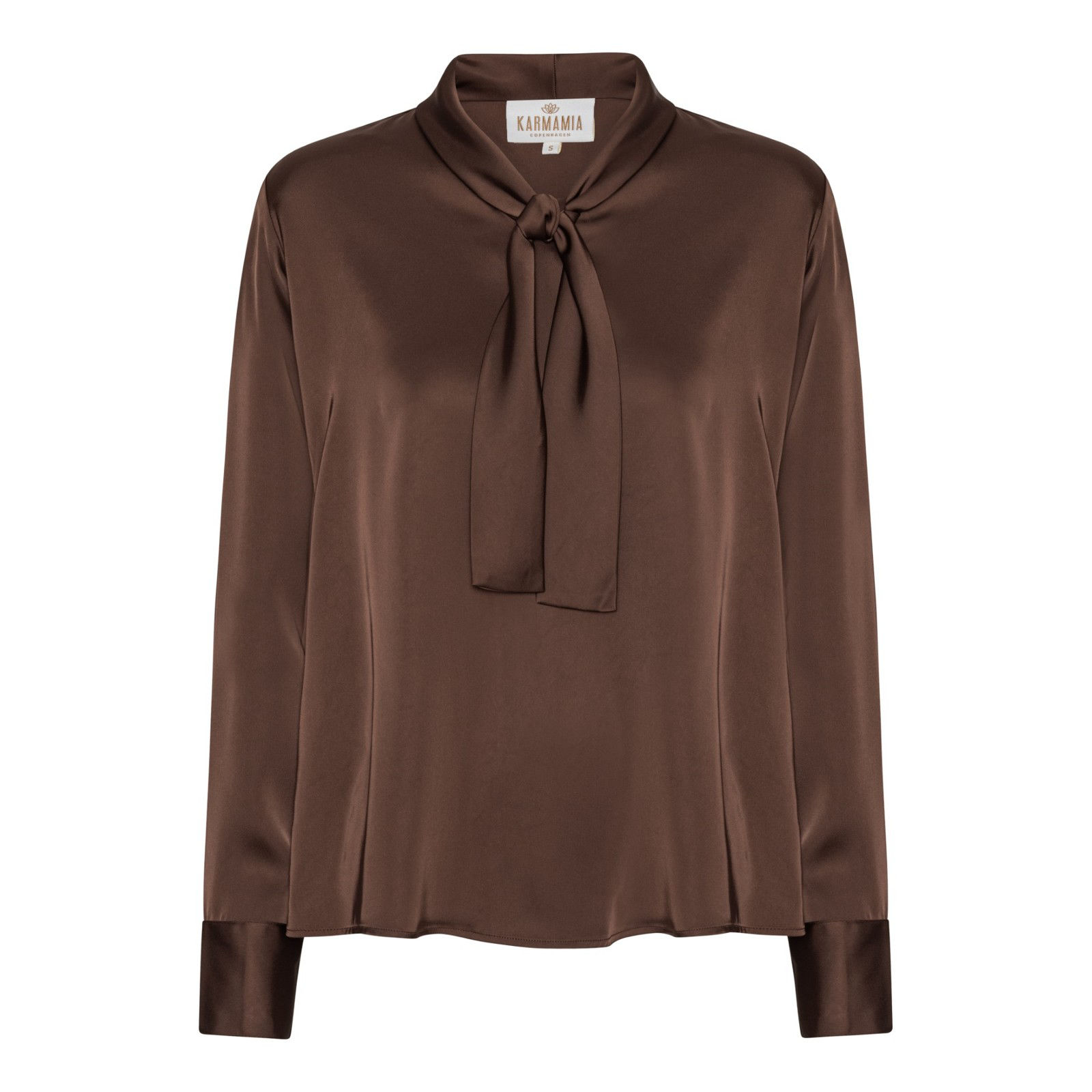Super smuk og minimalistisk bindebluse i satin fra Karmamia med multifunktion. Kan bindes som sløjfe, sømandsknude eller stå åben.