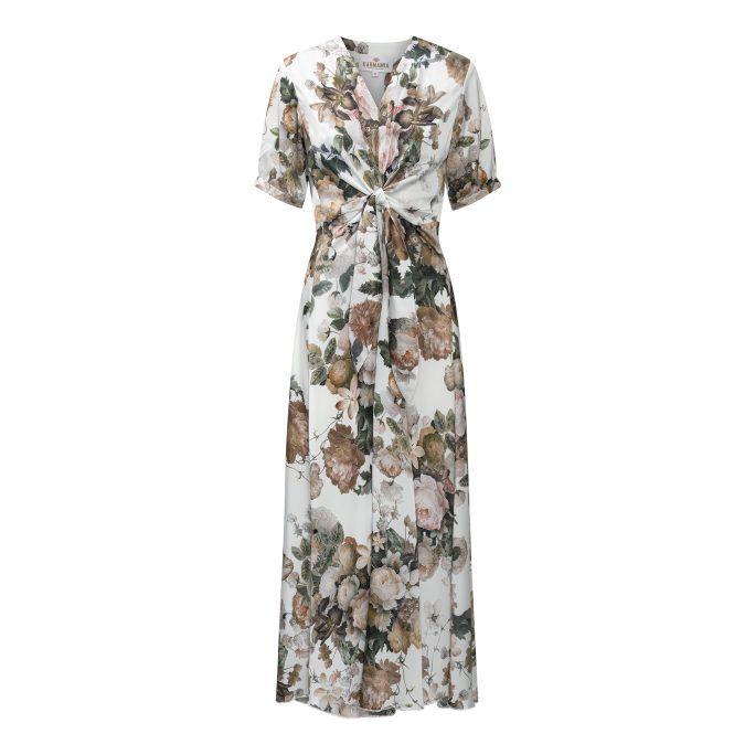 Smuk og elegant maxikjole fra Karmamia med det flotteste blomstermønster. Kjolen er designet med v-udskæring, korte ærmer og bindebåd i taljen.