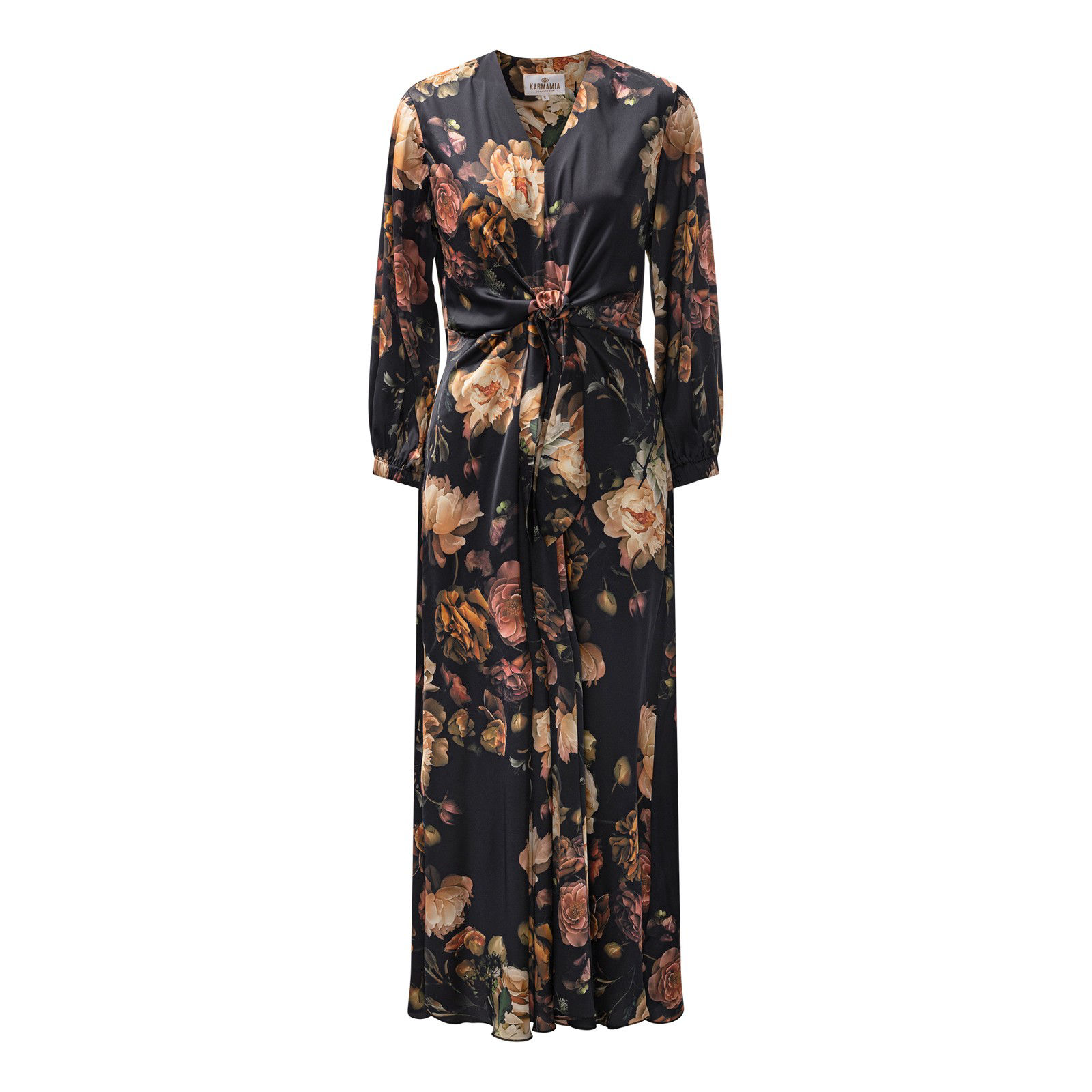 Formel maxikjole fra Karmamia med V-hals og bindebånd i taljen. Den smukke kjole har lange ærmer med elastik kant.