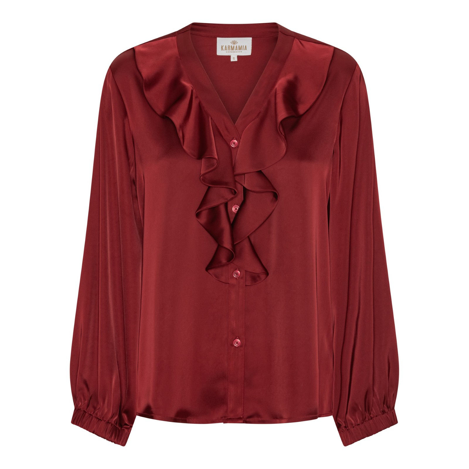 Smuk og elegant Skjorte fra Karmamia med det flotteste mønster, V-hals samt flæsedetalje. Skjorten har lange ærmer der udformer sig med elastik kant ved håndleddet.