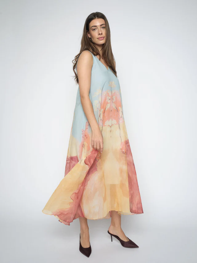 Denne lange kjole er skabt i en let og luftig kvalitet med et håndmalet print, der giver et unikt og iøjnefaldende udtryk. Den dybe V-udskæring og ærmeløse silhuet understreger det feminine look, mens den afslappede pasform sikrer et smukt og ubesværet fald. En elegant style, der fungerer perfekt til både varme sommerdage og særlige anledninger, hvor du ønsker et let, feminint og levende udtryk med masser af bevægelse. Er den ikke bare flot?