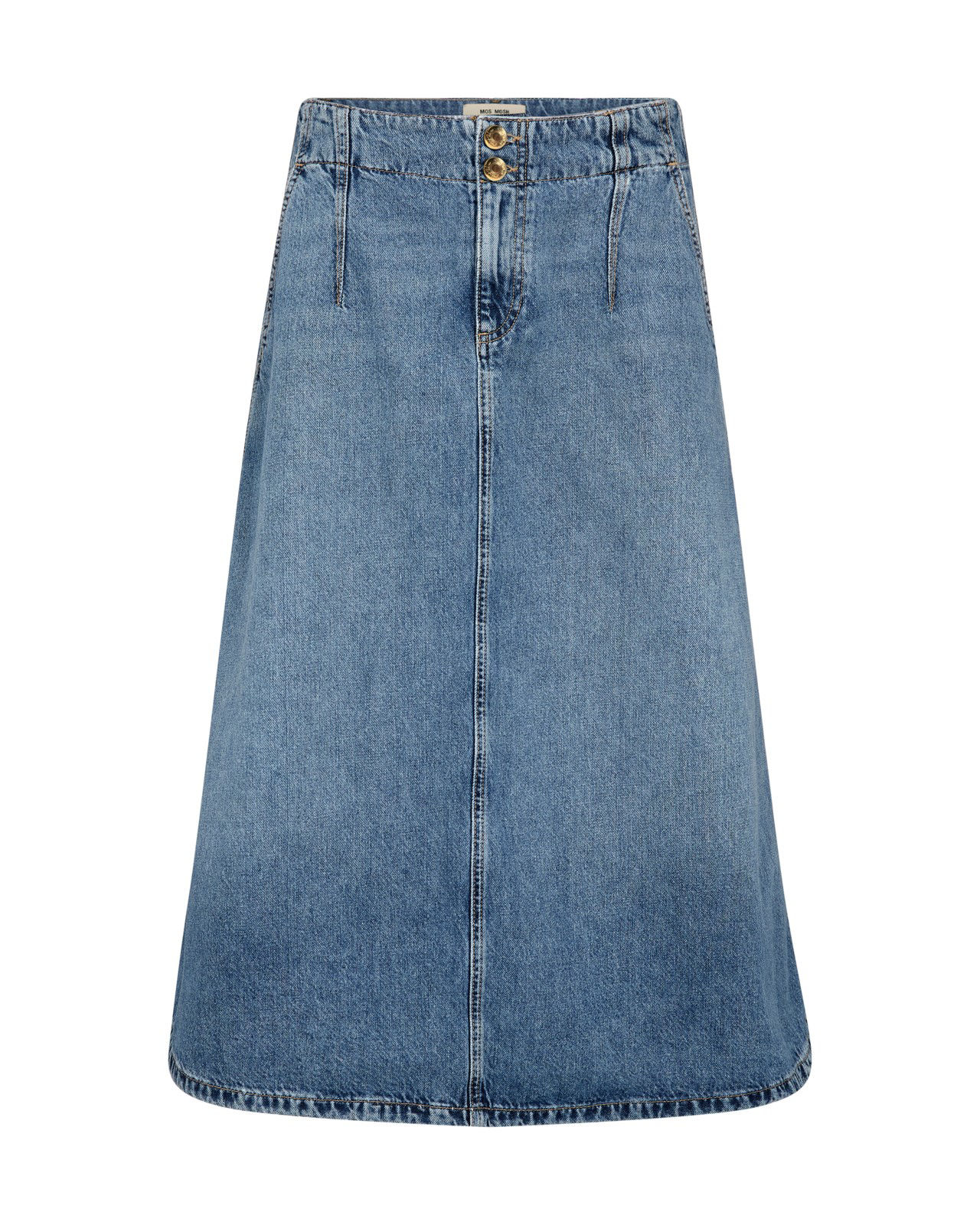 Flot A-formet denimnederdel fra Mos Mosh fremstillet i ren bomuld for et struktureret og holdbart udtryk. Den er designet med en flatterende mellemhøj talje og skjult knap- og lynlåslukning, der giver et rent og alsidigt look