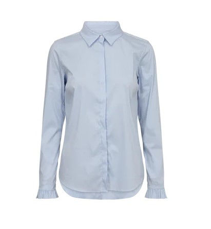Mos Mosh Skjorte Mattie Flip, Skjorten har krave og er gennemknappet med skjult knapåbning. Derudover er den længere bagtil end foran og har lange ærmer med en fin flæsekant forneden.