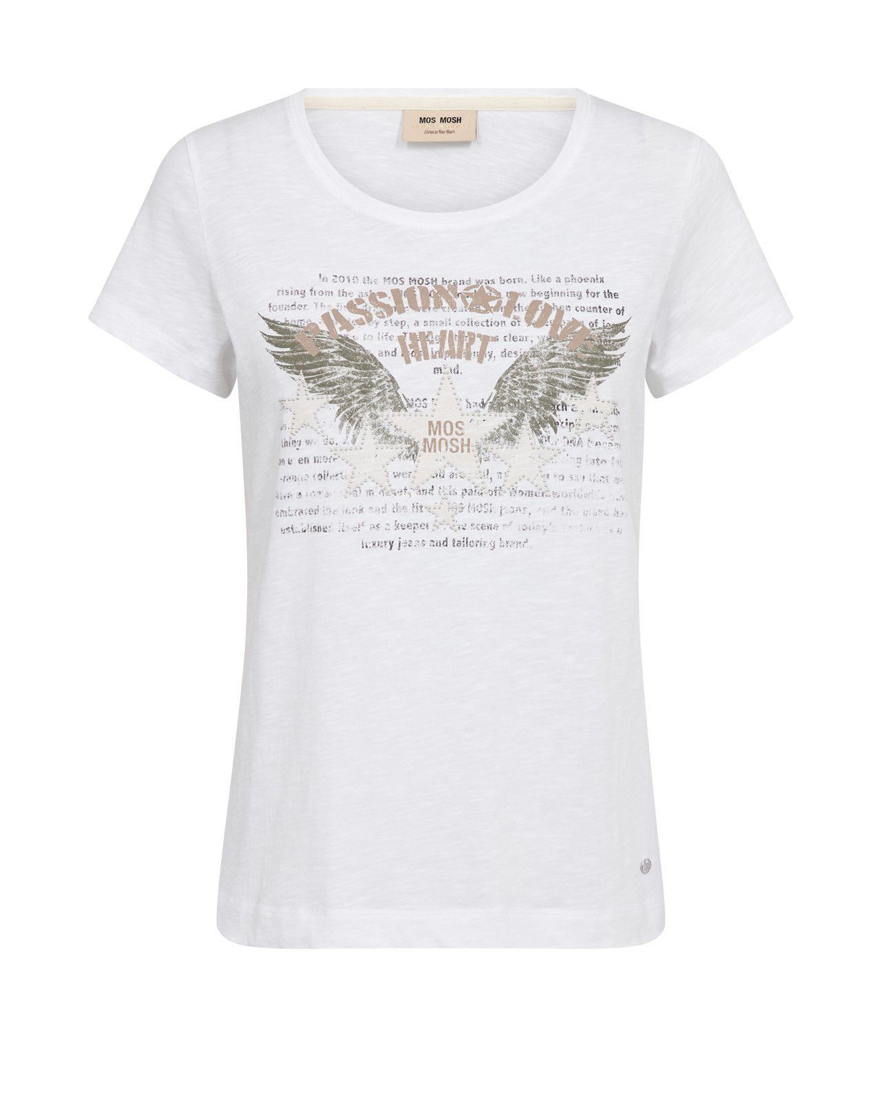 En lidt tætsiddende T-shirt i blød, økologisk bomuld med et cool, råt udtryk. Det grafiske print med logo, stjerner og vinger har et let slidt look, der giver en diskret rock’n’roll vibe og tilfører kant til et ellers enkelt design. Perfekt til jeans og en jakke for et afslappet, men stilfuldt hverdagslook. Findes også i brun. Besøg os i Stenløse eller bestil den nemt online.