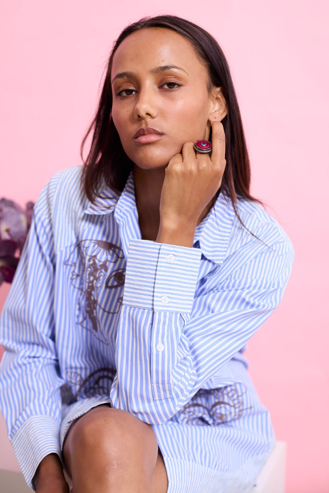 En skjorte, der hurtigt bliver en favorit i garderoben – designet i en lækker kvalitet, som føles behagelig og ser flot ud hele dagen. De blå og hvide striber giver et klassisk og friskt udtryk, mens det fine broderi tilfører noget unikt og personligt. Pasformen er afslappet, så den er nem at style både til jeans, bukser eller over en top, alt efter hvilket look du går efter. En alsidig skjorte, du kan bruge igen og igen – både til hverdag og når det gerne må være lidt pænere. Kig forbi os i Stenløse eller gør den til din egen i dag.